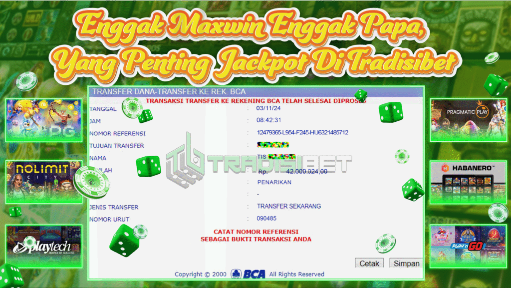TRADISIBET mengucapkan selamat kepada user id : CAGV*** yang telah berhasil mendapatkan jackpot SLOT pada bettingan POKER MANIA TRADISIBET. Kemenangan sebesar Rp 42.000.024,-. telah dibayarkan LUNAS oleh pihak tradisibet kepada pemilik user id setelah yang bersangkutan mengisi formulir withdraw. Proses pencairan dana berlangsung sangat cepat hanya dalam waktu 2-5 menit sudah berada dalam rekening pemilik user id. Bukti transfer yang dapat anda lihat adalah bukti SAH / VALID yang langsung didapatkan melalui bukti transaksi dari Bank yang digunakan untuk pengiriman dana pada rekening pemilik user id. Terima kasih kami sampaikan kepada para pengguna setia TRADISIBET yang telah menggunakan situs kami, sebagai Bandar Terpercaya yang pastinya membayar semua kemenangan member hingga lunas. Apakah TRADISIBET PENIPU ? Reputasi “TRADISIBET TERPERCAYA” sudah sangat melekat. puluhan hingga ratusan ribu pengguna setia TRADISIBET tetap menggunakan situs terbesar dan terbaik di Indonesia ini. Hapus rasa was-was dan khawatir anda, karena berapapun kemenangan anda PASTI dibayarkan hingga lunas.