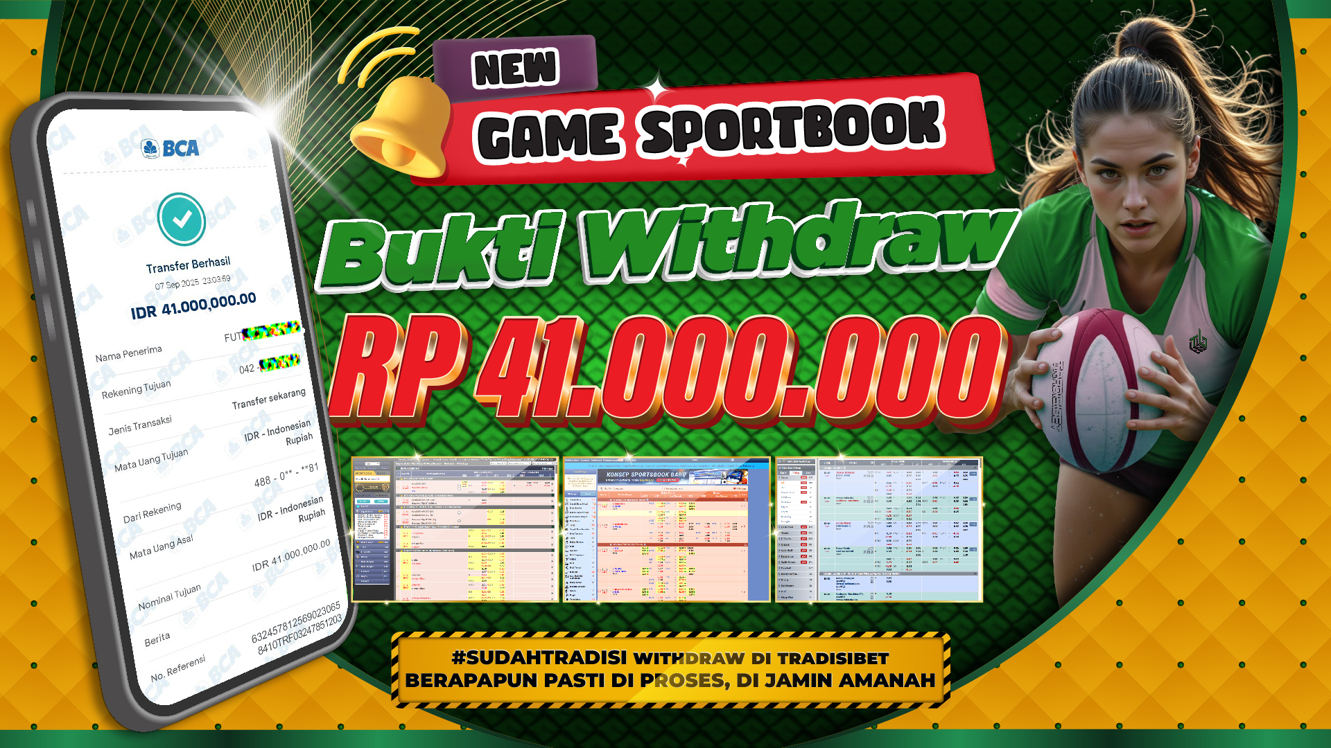 Dunia hiburan online kembali diramaikan dengan kabar gembira dari platform terpercaya TRADISIBET. Pada 07 September 2025, seorang member setia berhasil mencatatkan kemenangan fantastis di kategori SPORTBOOK dengan total hadiah sebesar Rp 41.000.000,-. Tidak hanya membanggakan, kemenangan ini juga membuktikan bahwa TRADISIBET benar-benar membayar lunas setiap kemenangan tanpa potongan dan selalu mengutamakan kepuasan para pemainnya.